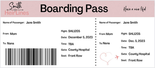 Looking for a clever, unique, (and quick!) way to tell your partner, family and/or friends that a baby is on the way? Look no further than our digital downloadable HeirLine Tickets. These customizable boarding passes can be ready in just minutes so you don't have to keep your secret a moment longer than you want too!